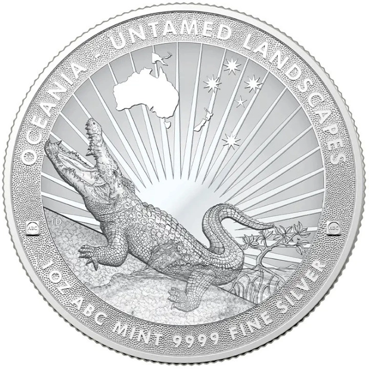 Az érme hátoldalán egy természetes élőhelyén, tátott szájjal álló krokodil látható, valamint a fém súlya, tisztasága, az „OCEANIA” és „UNTAMED LANDSCAPE” feliratok.