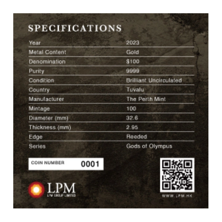 Az Apollót ábrázoló aranyérme tiszta Au.9999 aranyból készült, súlya egy troy uncia, átmérője 32,6 mm. A 2023-as érme a Gods of Olympus sorozat kilencedik darabja. Az érme a tuvalu-i kormány által garantált, és az országban törvényes fizetőeszköz. Fontos, hogy ez egy szigorúan limitált, 100 darabos kibocsátású aranyérme. Érdemes tehát érdeklődni ez iránt az érme és az egész sorozat iránt.