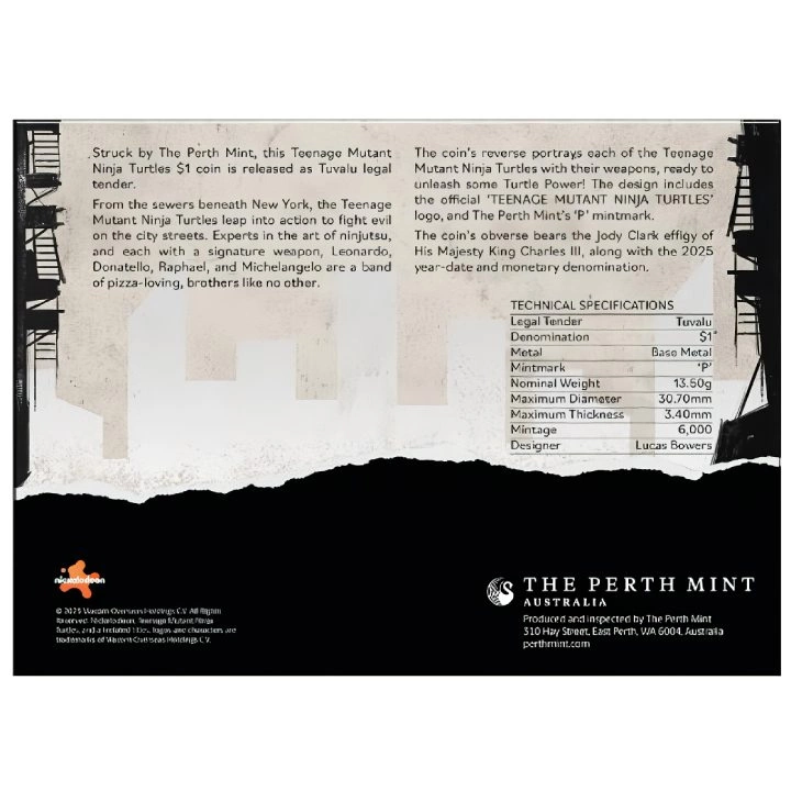A 2025-ös Teenage Mutant Ninja Turtles érme egy egyedülálló gyűjtői darab, amely biztosan vonzó lesz azoknak a rajongóknak, akik ezeket az ikonikus karaktereket kedvelik és egyedi lehetőségeket keresnek. A 13,5 gramm alumínium-bronzból készült érme négy harcos – Donatella, Leonardo, Raphael és Michelangelo – ábrázolását mutatja, akik jellegzetes fegyvereikkel felfegyverkezve készek a bűnözés elleni küzdelemre. Ez a The Perth Mint által gyártott limitált kiadás lehetőséget kínál arra, hogy egyedi gyűjtői érmét szerezzen a „Teenage Mutant Ninja Turtles” univerzum legendás hőseivel kapcsolatban. Az érme egy tematikus kártyában érkezik, amely lehetővé teszi, hogy a csomagolásból kivéve megtekintse mind az előlapját, mind a hátlapját. Ez kiváló választás mind a sorozat rajongói, mind az eredeti popkultúra-tárgyakat kereső gyűjtők számára. Előlap: Az előlapon Jody Clark által készített III. Károly király képe, valamint a kibocsátás dátuma – 2025 – és az érme névértéke látható. Hátoldal: A hátoldalon a négy Ninja Turtles jellegzetes motívuma látható. A karakterek mellett a „TEENAGE MUTANT NINJA TURTLES” logó és a „P” pénzverdejel található, amely garantálja az érme hitelességét.Segítségre van szüksége? Van kérdése??Tegye fel kérdését, és mi azonnal válaszolunk, a legérdekesebb kérdéseket és válaszokat közzétesszük mások számára.