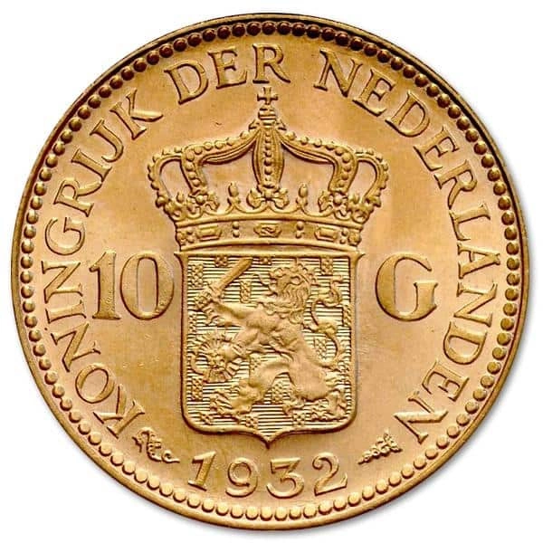 Moneta 10 guldenów królowej Wilhelminy została wybita przez Holenderską Mennicę Królewską. Te złote monety szczycą się długą oraz udaną historią bicia. Złoty Gulden został wybity w próbie 900 oraz posiada domieszkę miedzi, dzięki czemu zachowuje wysoką odporność na zarysowania oraz uszkodzenia. Zawartość całkowita złota wynosi 6,056 grama, przy wadzę całkowitej 6,792 grama.