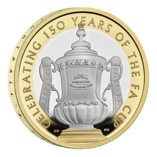 Il rovescio della moneta raffigura la coppa e la scritta “CELEBRATING 150 YEARS OF THE FA CUP”. Il rovescio è stato disegnato da Matt Dent e Christian Davies.