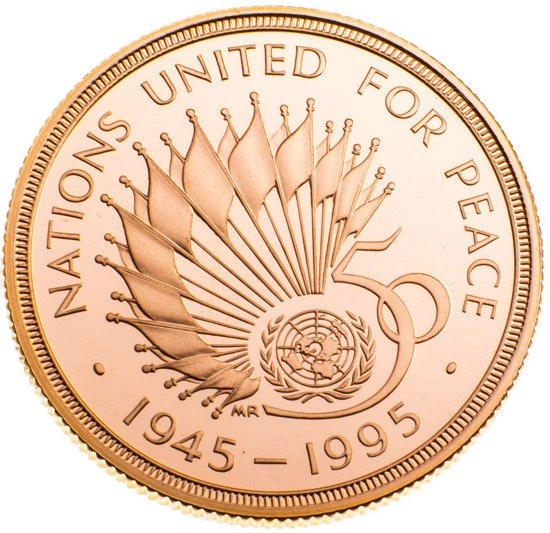 Kolekcjonerska moneta wybita z okazji 50 rocznicy powstania Organizacji Narodów Zjednoczonych. ONZ jedna z największych organizacji istniejących na świecie, jej członkami jest 193 narodów. Za główny cel ONZ stawia sobie zapewnienie pokoju i bezpieczeństwa międzynarodowego, rozwój współpracy między narodami oraz popieranie przestrzegania praw człowieka. Ta złota moneta z lustrzanym stemplem zawiera w sobie 22 karaty i waży 15.98 g. Dodatkowo moneta jest sprzedawana w eleganckim etui oraz z certyfikatem autentyczności.