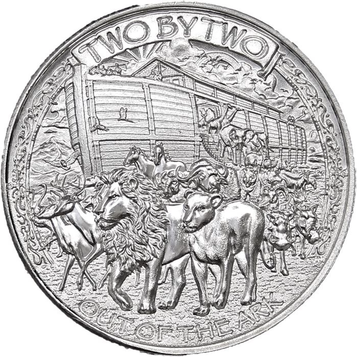 Il dritto raffigura gli animali che escono dall'arca, guidati da una coppia di leoni, e le scritte “TWO BY TWO” e “OUT OF THE ARK”.