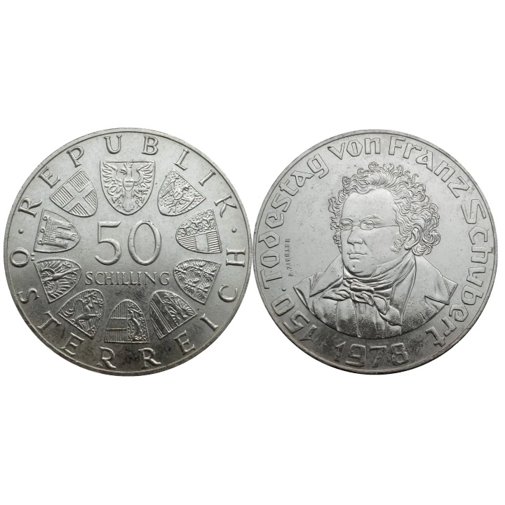 Sul rovescio sono raffigurati 9 stemmi, al centro è riportato il valore nominale: 50 SCHILLING.