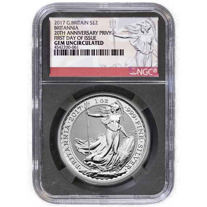 Britannia 1 oncia d'argento 2017 20° anniversario Privy NGC Gem Non circolata Primo giorno di emissione
