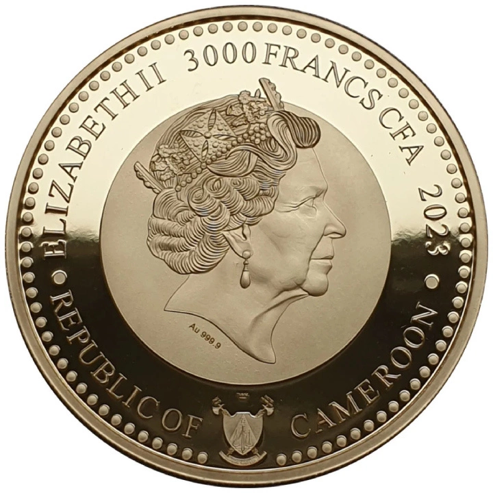 Il dritto della moneta d'oro raffigura l'immagine della regina Elisabetta II e lo stemma della Repubblica del Camerun, oltre alle informazioni sull'anno di conio e al valore nominale della moneta.