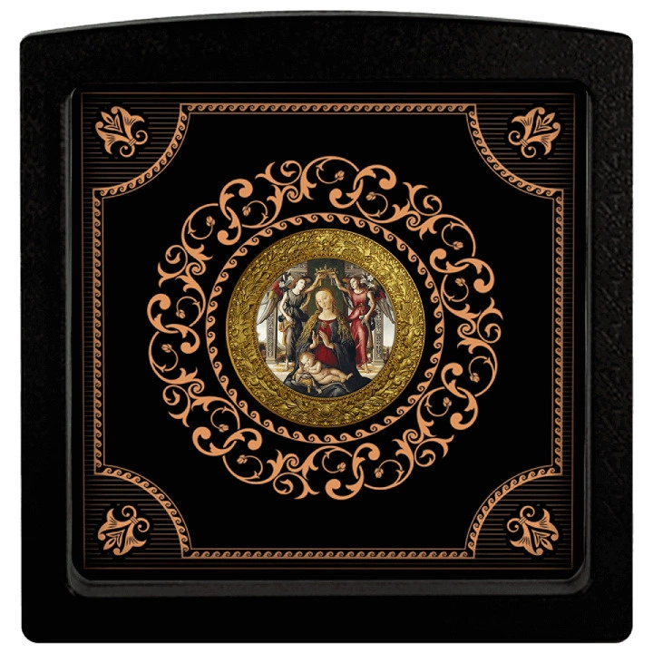 Sul rovescio della moneta è raffigurata una riproduzione colorata dell'opera, che mostra due angeli che portano gigli, che camminano verso la Madonna e la incoronano Regina dei Cieli. Il Bambino Gesù giace su un cuscino ricamato, sulle ginocchia della Madre.
