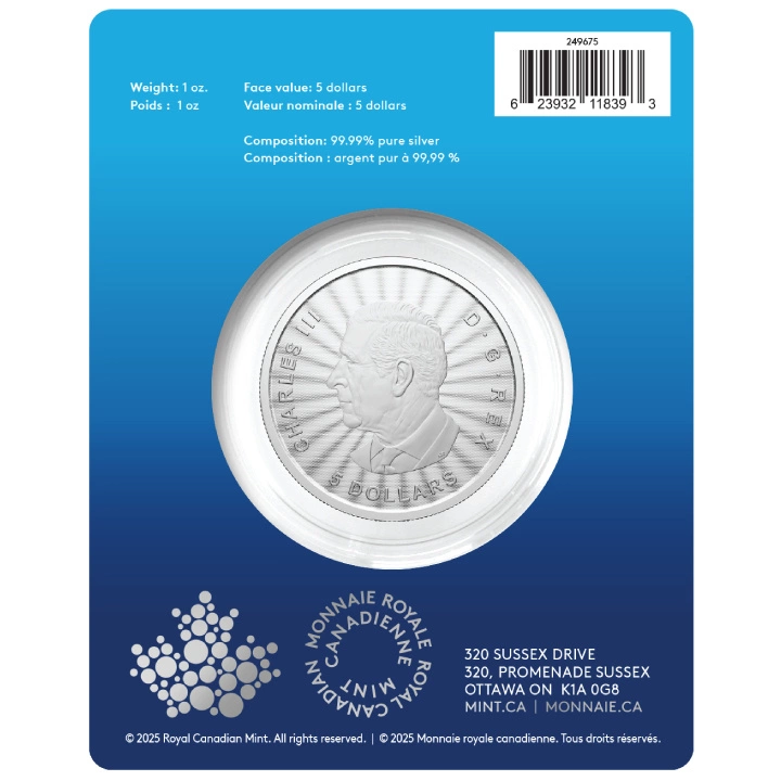 La moneta è coniata in argento Ag.9999, ha un peso di 1 oncia troy e un diametro di 38 mm. La tiratura del prodotto è di 20.000 pezzi. La moneta viene consegnata nella sua confezione originale certificata. Inoltre, questo straordinario esemplare è stato prodotto dalla zecca The Royal Canadian Mint. La moneta è garantita dal governo canadese per quanto riguarda la sua legalità, la purezza del metallo e la provenienza del metallo, ed è anche un mezzo di pagamento a tutti gli effetti nel paese dell'emittente.