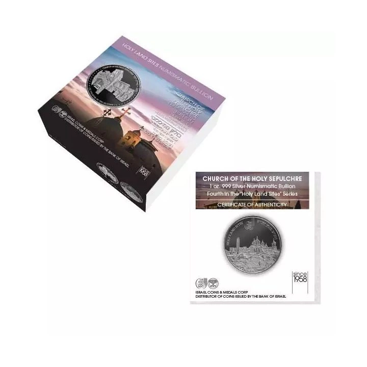 Il dritto raffigura l'ingresso principale della Basilica del Santo Sepolcro, la Cappella dei Franchi e la scritta “CHURCH OF THE HOLY SEPULCHRE”. Sul dritto sono riportate le informazioni relative all'anno, alla purezza e al peso del metallo, scritte in ebraico e in inglese.