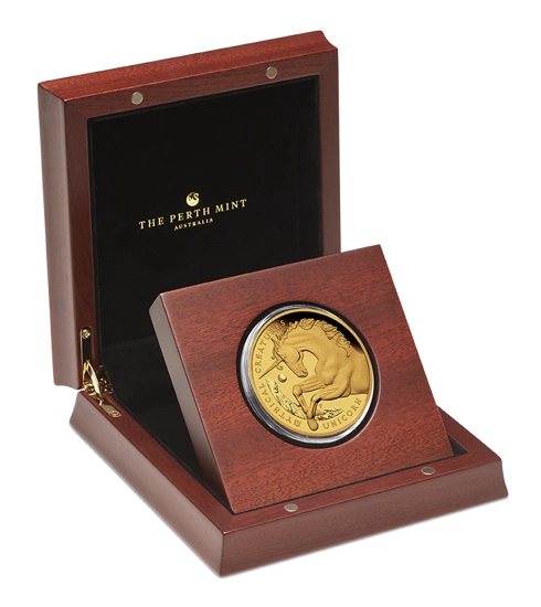 Mityczne Istoty: Jednorożec to egzemplarz, który został wyprodukowany z czystego kruszcu o wadze 5 uncji trojańskich oraz próbie Au.9999. Jego producentem jest najstarsza australijska mennica - The Perth Mint.