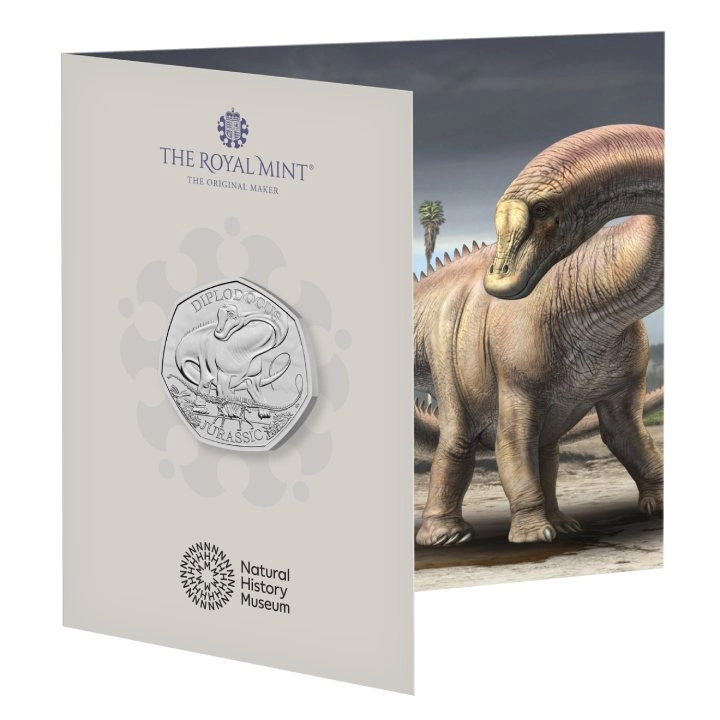 Il rovescio della moneta raffigura un Diplodocus nel suo habitat naturale e la scritta “DIPLODOCUS”, “JURASSIC”