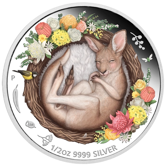 Rewers przedstawia uroczego, śpiącego kangurka w gnieździe w otoczeniu kolorowych australijskich kwiatów. Na rewersie znajduje się również znak mennicy Perth Mint "P" wraz z informacją o wadze i czystości kruszcu.