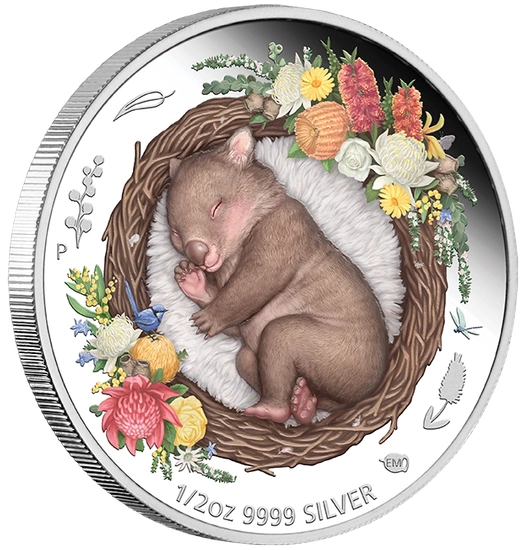 Rewers przedstawia urocze dziecko Wombata, śpiące w gnieździe w otoczeniu kolorowych, australijskich kwiatów. Na rewersie znajduje się również znak mennicy Perth Mint "P" wraz z informacją o wadze i czystości kruszcu. Projektantką rewersu była Elise Martinson.