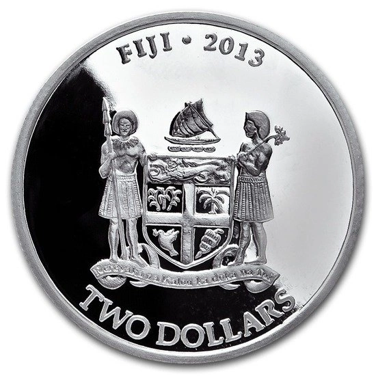 Awers monety zdobi herb fiji oraz nominał i rok wybicia monety
