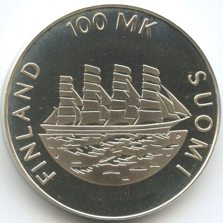 Il rovescio riporta solitamente il valore nominale “100 MK”, il nome dell'emittente “SUOMI FINLAND”, l'anno di emissione e altri elementi grafici, come ritratti, simboli sportivi o personaggi storici, a seconda dell'edizione specifica della moneta.
