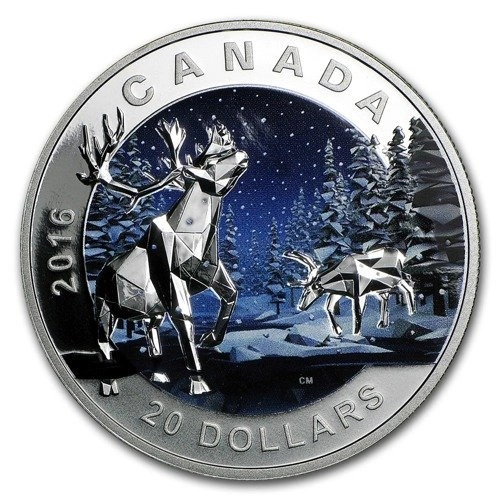 Rewers przedstawia dwa osobniki karibu w ich naturalnym środowisku, zamieszkują one bowiem tundrę arktyczną. Tak jak poprzednie monety obraz skupia w sobie wiele geometrycznych kształtów, sylwetki karibu stworzone są z idealnie złączonych ze sobą wielokątów, a zastosowane kolory- odcienie bieli, granatu, szarości i zieleni- dają poczucie, jakbyśmy patrzyli na niesamowicie realistyczny obraz.