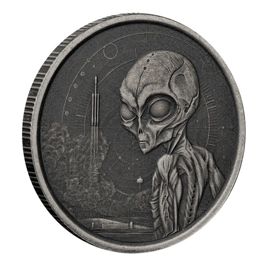Na rewersie monety widnieje wizerunek kosmity, który obserwuje rakietę kosmiczną, startującą z Ziemi.