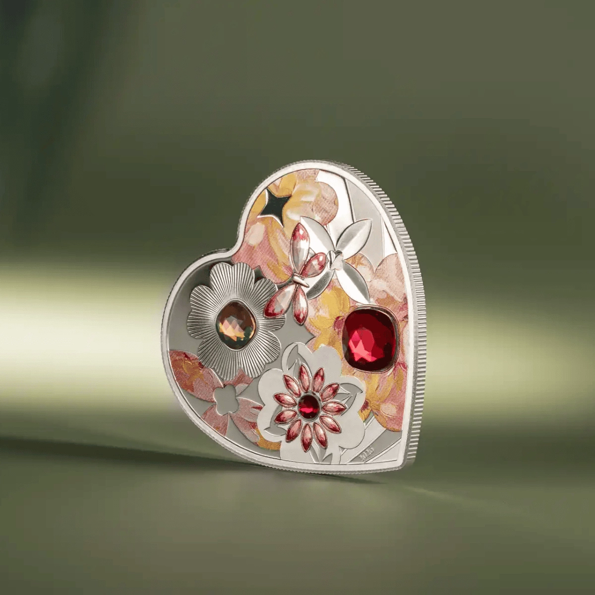 Rovescio mostra un delicato motivo floreale che simboleggia l’amore in fiore. I petali colorati in tonalità pastello creano una composizione armoniosa e tre lucenti inserti di cristallo aggiungono brillantezza ed eleganza all’insieme. La combinazione di argento, dettagli cromatici e accenti cristallini rende la moneta estremamente scenografica e ideale come dono unico e ricco di simbolismo.