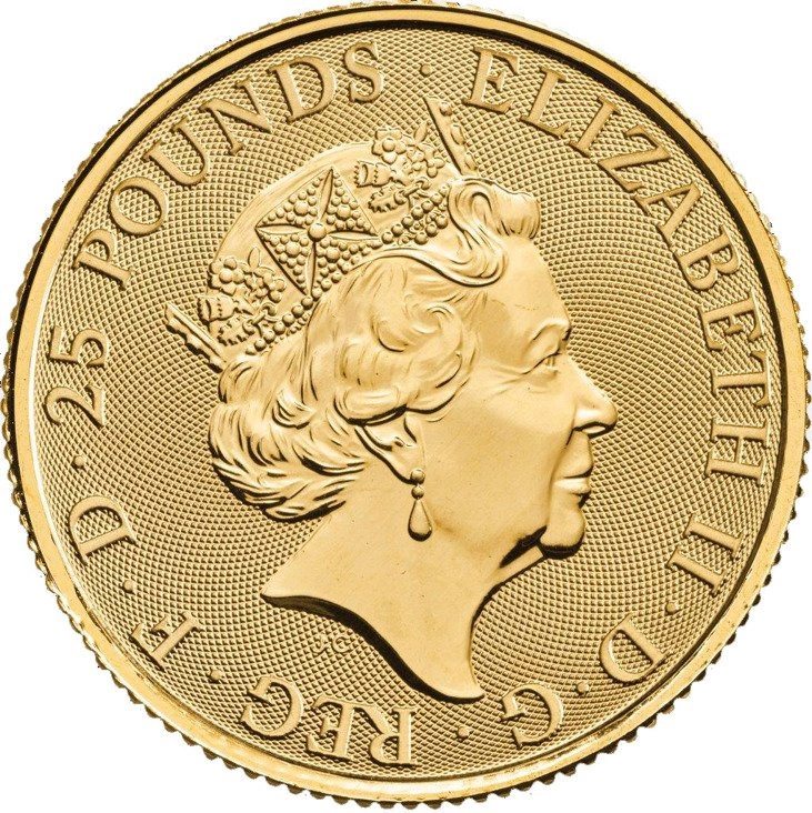 Awers monety przedstawia byka, nad którym widnieje informacja o wadze monety i próbie kruszcu, wynoszącej 9999 złota. Na rewersie monety widnieje wizerunek królowej brytyjskiej, Elżbiety II, nad którą wygrawerowany został tytuł królewski po łacinie, Dei Gratia Regina Fidei Defens, który w oryginalnie brzmi The grace of God, Queen, Defender of the Faith. Podany jest również nominał monety, który wynosi 25 funtów.