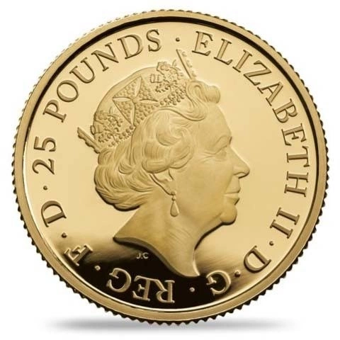 Awers monety przedstawia byka, nad którym widnieje informacja o wadze monety i próbie kruszcu, wynoszącej 9999 złota. Na rewersie monety widnieje wizerunek królowej brytyjskiej, Elżbiety II, nad którą wygrawerowany został tytuł królewski po łacinie, Dei Gratia Regina Fidei Defens, który w oryginalnie brzmi The grace of God, Queen, Defender of the Faith. Podany jest również nominał monety, który wynosi 25 funtów.