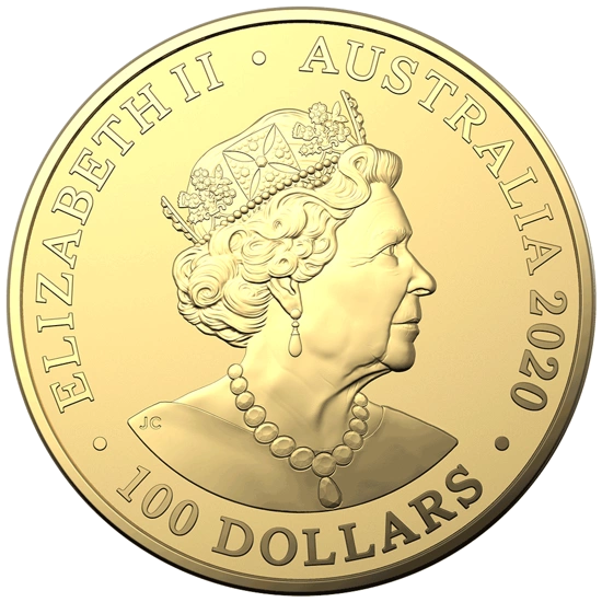 Awers złotej monety przedstawia Królową Elżbietę II, projektu Jody’iego Clark’a, wraz z informacją o wartości nominalnej, krajem emitenta oraz rokiem wybicia.