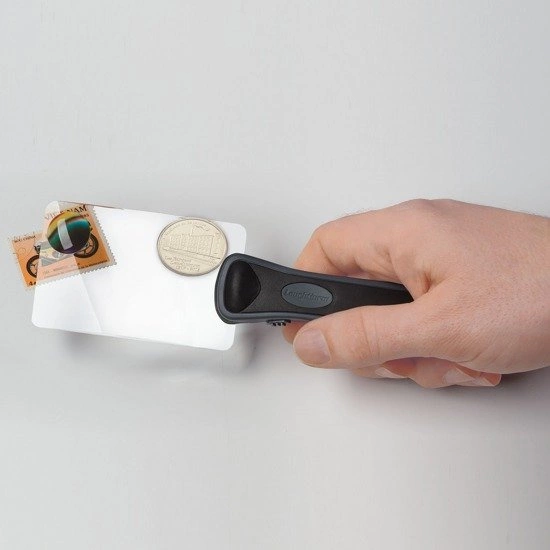 Poręczna Lupa z uchwytem o 2-krotnym powiększeniu stanowi idealne urządzenie do użytku domowego. Lupa posiada prostokątną bezbramkową soczewkę o wymiarach 90 x 55 mm. W górnej części soczewki znajduję się zintegrowana mała soczewka o średnicy 19 mm oraz 6-krotnym powiększeniu. Lupa została wyposażona w dwie diody LED. W komplecie oprócz lupy znajdują się 3 baterię SR1130 oraz służący do ochrony soczewki miękki pokrowiec.