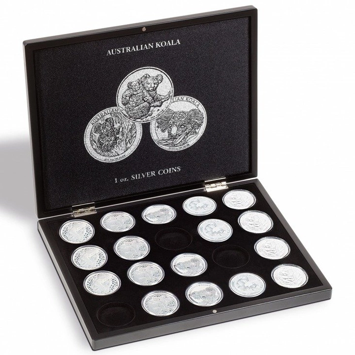 Zakup kasety będzie idealnym rozwiązaniem do przechowywania wszystkich monet Koala, bez względu na rok bicia. Wykonano ją z materiałów najwyższej jakości i z dbałością o każdy detal. Produkt posiada wymiary 305 x 245 x 30 mm. Na pokrywie oraz na wewnętrznej części kasety znajduje się srebrny napis "AUSTRALIAN KOALA 1 OZ SILVER COINS". Wnętrze kasety zostało wysłane satyną oraz posiada zamknięcie magnetyczne. Producentem kasety jest Leuchtturm.