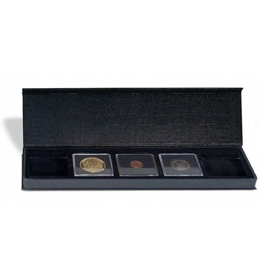 Welurowe wnętrze w ciemnogranatowym odcieniu stanowi idealne tło dla cennych numizmatów ze srebra, złota, platyny lub miedzi. Etui Airbox jest przystosowane do przechowywania monet w kapslach Quadrum marki Leuchtturm lub w holderach o wymiarach 50 x 50 mm.