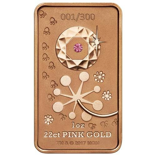 Il dritto del lingotto riporta il peso e la purezza del metallo, il numero impresso e un diamante rosa.
