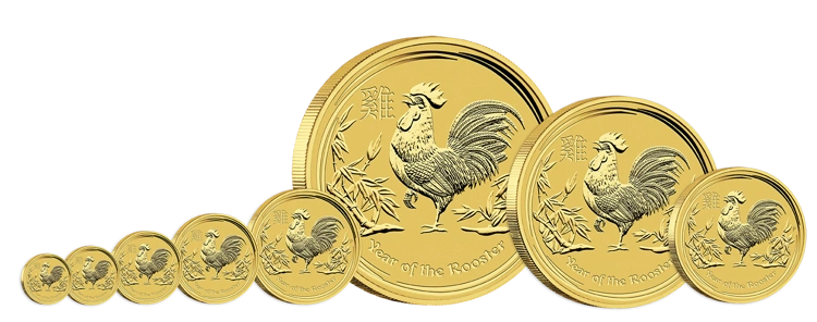 Year of the Rooster (Rok Koguta), to moneta z serii Lunar II. Jej niezwykłe piękno i staranne wykonanie sprawia,że ta moneta jest nie tylko dla osób chcących zabezpieczyć swój kapitał, ale także dla tych, którzy cenią sobie wartość kolekcjonerską. Wartość monet z serii Lunar rośnie z roku na rok, dlatego nie muszą się Państwo obawiać straty kapitału. Wykonane są ze złota o próbie 0.9999 i emitowane w gramaturach od 1/20 uncji do 1kg.