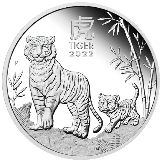 Rewers monet ukazuje dumnego, dorosłego tygrysa wraz z małym tygryskiem. Na rewersie znajduje się również chiński znak „tygrys”, napis „TIGER 2022” oraz literę "P" czyli znak mennicy The Perth Mint. Projektantką rewersu była Jennifer McKenna.