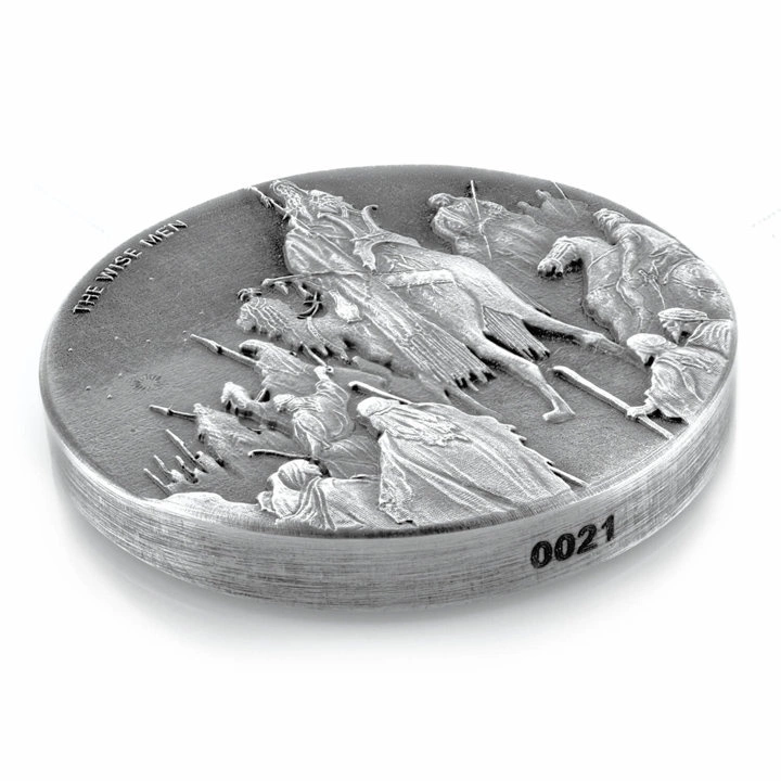 Sul rovescio è raffigurata la scena del viaggio dei Re Magi seguendo la Stella Cometa.
