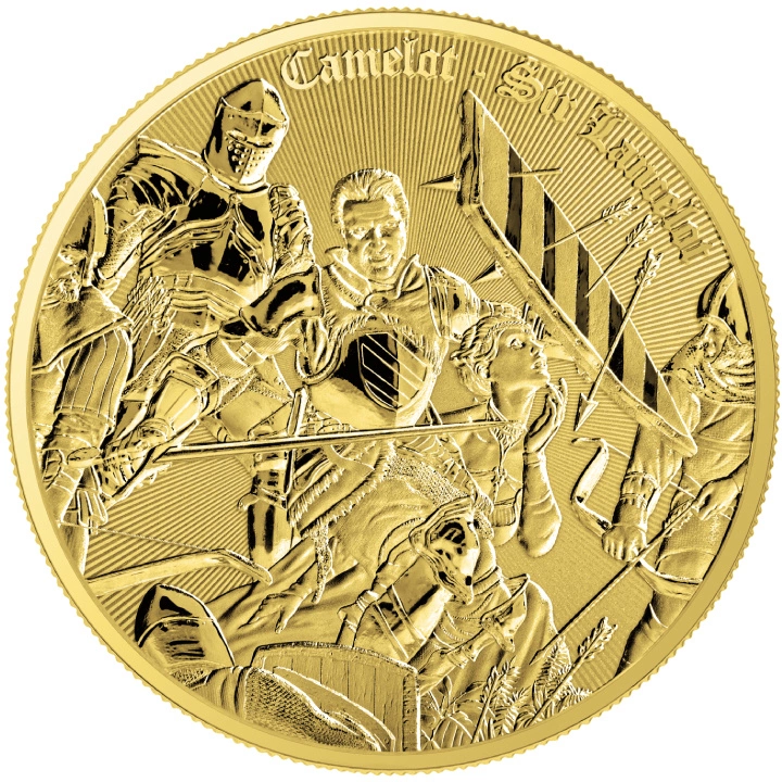 Sul rovescio della moneta è raffigurato Sir Lancillotto, rappresentato nel momento del trionfo come un valoroso cavaliere in armatura, con la spada in mano pronto a combattere. Sullo sfondo sono raffigurati il castello di Camelot e dettagli che sottolineano il suo ruolo di difensore della corte reale. Sul rovescio è presente anche la scritta “CAMELOT SIR LANCELOT”.