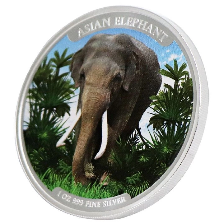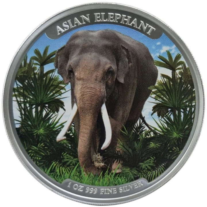 Il rovescio della moneta d'argento raffigura un elefante asiatico colorato e la scritta “ASIAN ELEPHANT”, nonché il peso e il titolo del metallo.