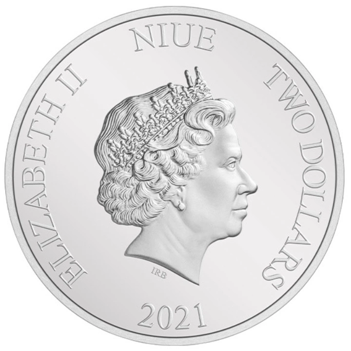Il dritto della moneta d'argento raffigura l'effigie della regina Elisabetta II, la scritta “ELIZABETH II”, “NIUE” e il valore nominale e l'anno di emissione della moneta. Il dritto è stato disegnato da Ian Rank-Broadley.