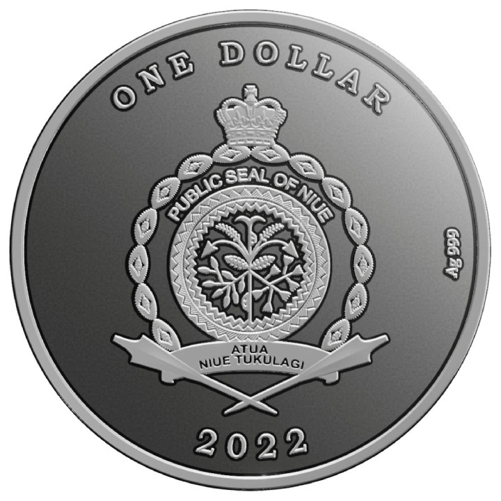 Il dritto della moneta d'argento presenta lo stemma di Niue insieme alle informazioni sul valore nominale, la purezza del metallo e l'anno di conio.