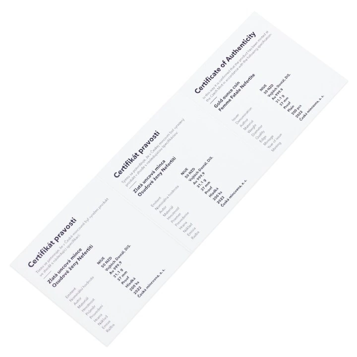 Il rovescio raffigura il busto di Nefertiti. Sul rovescio sono riportate la scritta “NEFERTITI” e le informazioni relative alla purezza e al peso del prodotto.