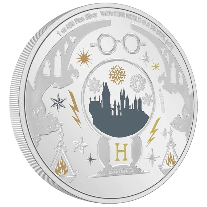 Il rovescio raffigura simboli colorati e il castello di Hogwarts con la scritta “HOGWARTS”. Sul rovescio sono riportate informazioni sul peso e sulla purezza del metallo.