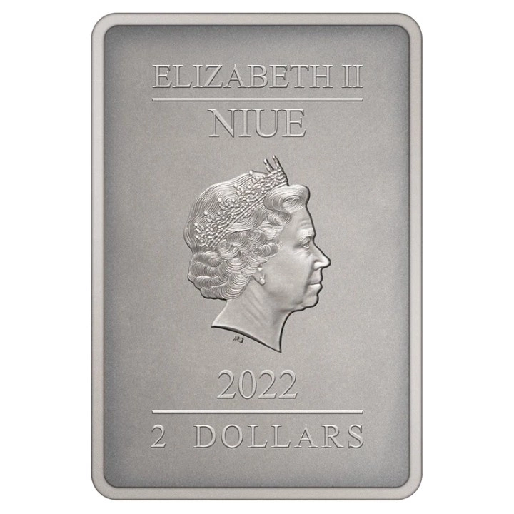 Il dritto della moneta d'argento raffigura l'effigie della regina Elisabetta II, la scritta “ELIZABETH II”, “NIUE” e il valore nominale e l'anno di emissione. Il disegnatore del dritto è Ian Rank-Broadley.