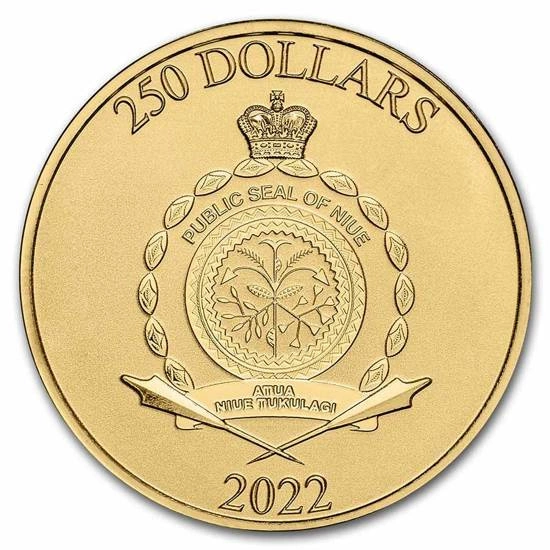 Il dritto della moneta d'oro mostra lo stemma di Niue (sigillo pubblico di Niue), l'anno di emissione e il valore nominale della moneta.