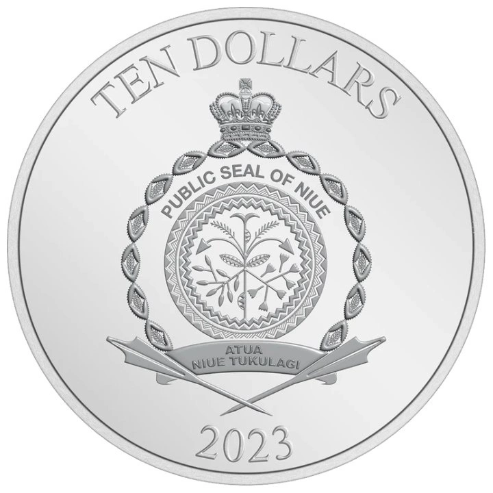 Il dritto della moneta d'argento raffigura lo stemma di Niue insieme alle informazioni sul valore nominale e sull'anno di conio.