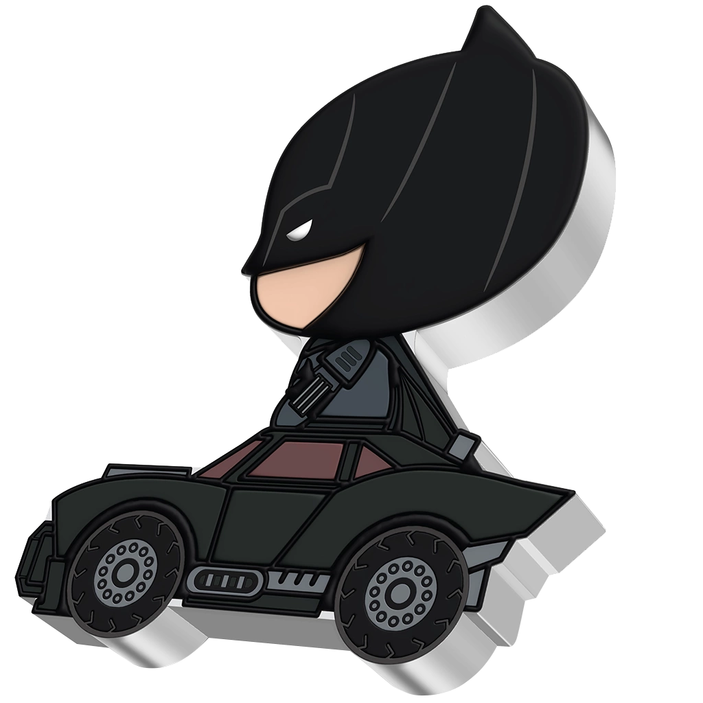 Rovescio presenta Batman che sfreccia con la Batmobile in stile chibi, richiamando direttamente il film "The Batman". La superficie colorata rende al meglio il carattere del personaggio e intensifica il design, creando una moneta da collezione attraente, ideale per i fan di Batman.