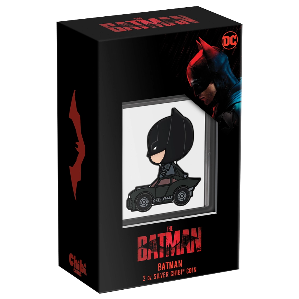 Niue: The Batman - Batman Day Chibi Coin colorata 2 once d'argento 2022 Proof è una moneta Chibi colorata della serie ispirata al film "The Batman", che raffigura il leggendario eroe nella caratteristica e giocosa estetica chibi. Il design mostra Batman alla guida della Batmobile, conferendo alla composizione dinamismo, spettacolarità e un carattere deciso. Questa forma stilizzata incontrerà il gusto sia degli appassionati dei fumetti DC sia dei collezionisti in cerca di realizzazioni non convenzionali.