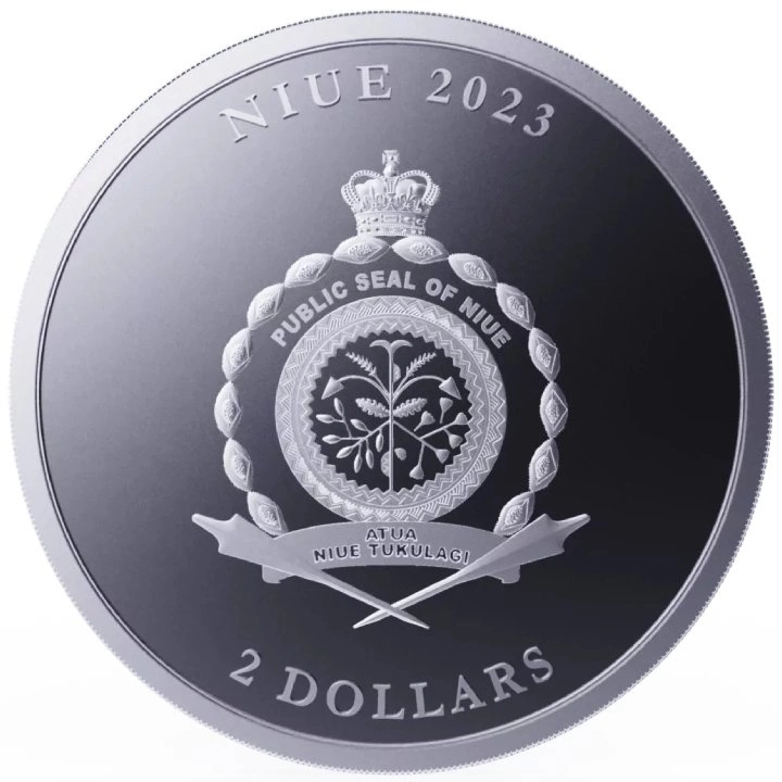 Il dritto della moneta raffigura lo stemma di Niue, la scritta “NIUE 2023” e il valore nominale.
