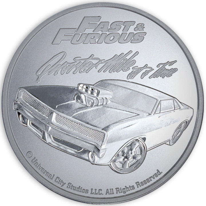 Il rovescio raffigura un'auto e reca la scritta “FAST & FURIOUS, QUARTER MILE AT A TIME”. Sul rovescio sono indicati il peso e la purezza del metallo.