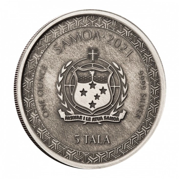 Il dritto della moneta d'argento è decorato con lo stemma di Samoa. Sul dritto sono riportate anche informazioni sul valore nominale, l'anno di conio, il peso, il titolo del metallo e il paese di emissione.