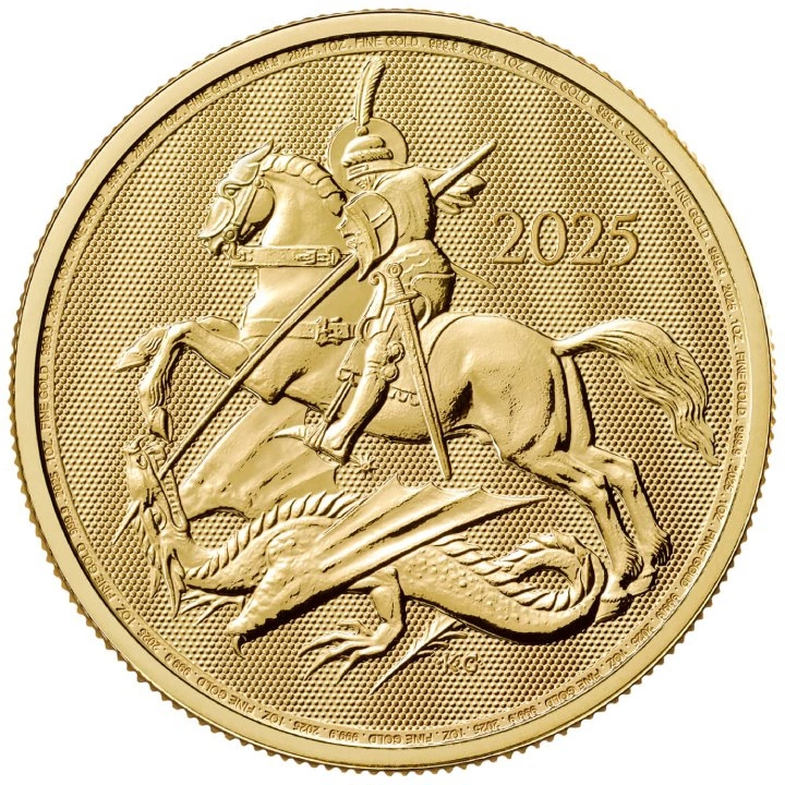 Rewers di George Kruger Gray, raffigura una drammatica rappresentazione della battaglia di San Giorgio con il drago. La composizione, ispirata allo stile gotico, mostra l'eroe che trafigge la bestia con una lancia, simboleggiando il trionfo del bene sul male. Il rovescio riporta anche informazioni sull'anno di emissione, il peso e la purezza del lingotto.