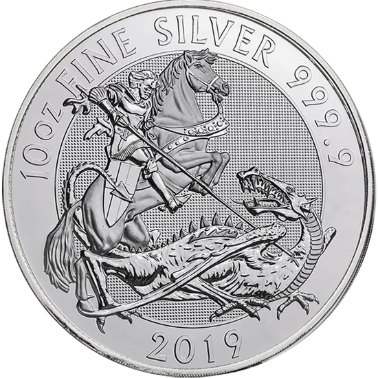 Srebrny walor z wizerunkiem Św. Jerzego i Smoka przedstawia kulminacyjny moment walki pochodzący ze znanej angielskiej legendy. Ten bulionowy okaz perfekcji został wyprodukowany w 2019 roku, o wadzę 10 uncji oraz próbie srebra 9999. Nowa moneta z Royal Mint powiela efekt wklęsłego projektu - incuse, który po raz pierwszy Royal Mintzastosował w 2018 roku.