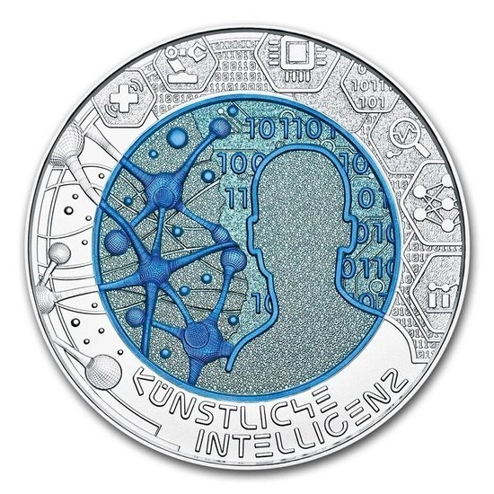 Sztuczna inteligencja 25 Euro 2019 to niobowo - srebrna moneta, która została wykonana z kruszcu próby Ag 900 oraz Nb 99,8. Waga czystego kruszcu to 9g/ 0.29 oz, natomiast waga całkowita monety to 16.5g. Za ograniczoną do 65 000 sztuk produkcję niobowej monety odpowiada europejski producent metali szlachetnych Austrian Mint. Co ważne, moneta z roku 2019 posiada gwarancję rządu Austrii oraz jest pełnoprawnym środkiem płatniczym na terenie kraju emitenta. Ponadto, Sztuczna inteligencja 25 Euro 2019 jest dostarczana wraz z indywidualnym certyfikatem autentyczności w eleganckim etui.