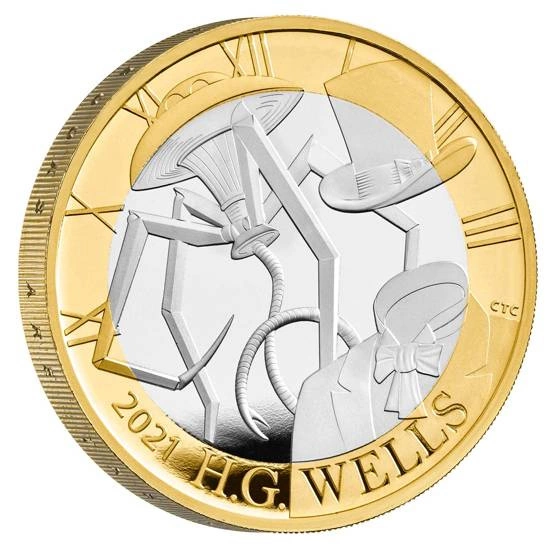 - H.G. Wells Silver Proof £2, moneta posiada stop Ag.925 pokryty złotem, wagę 12 gramów, średnicę 28.40mm, nominał £2.